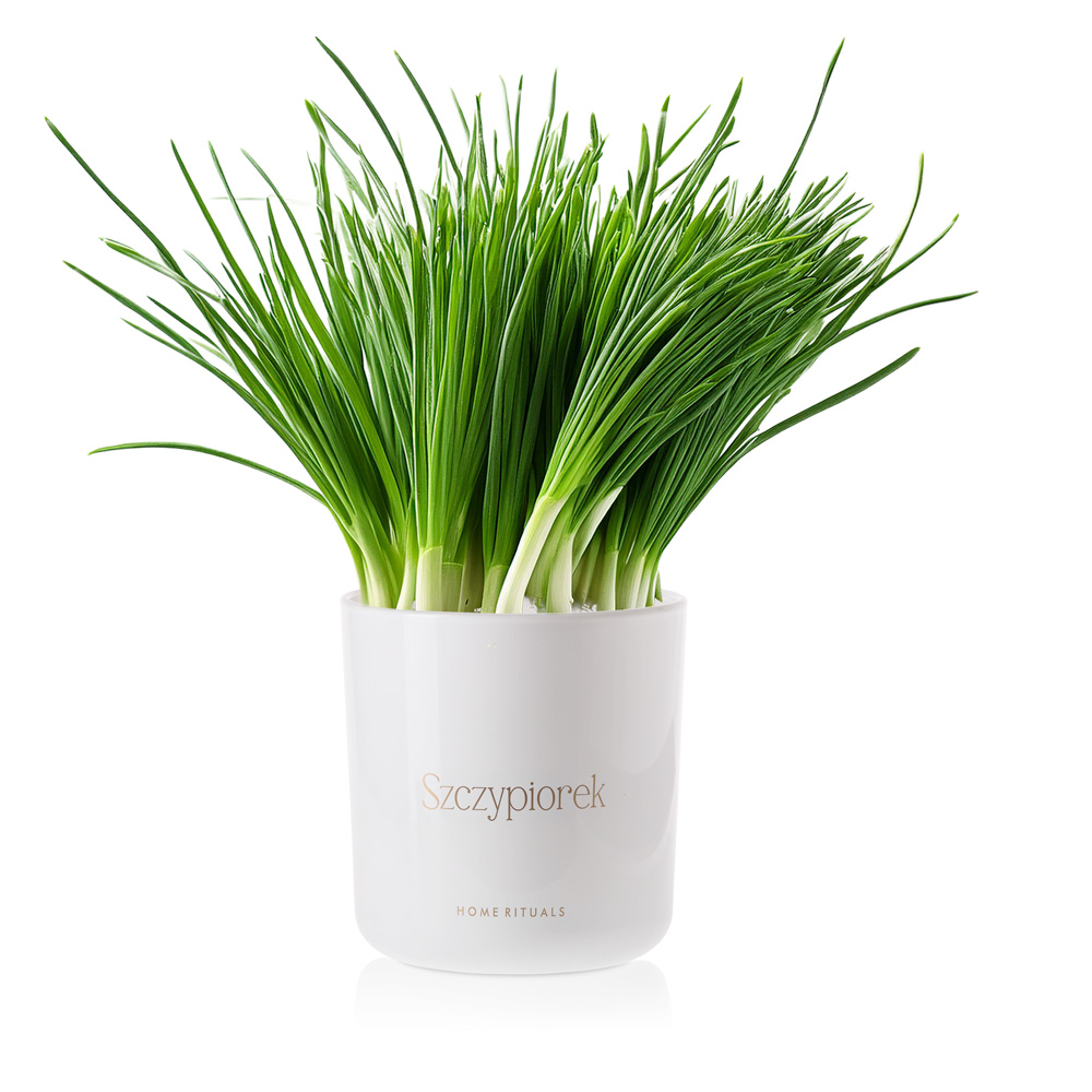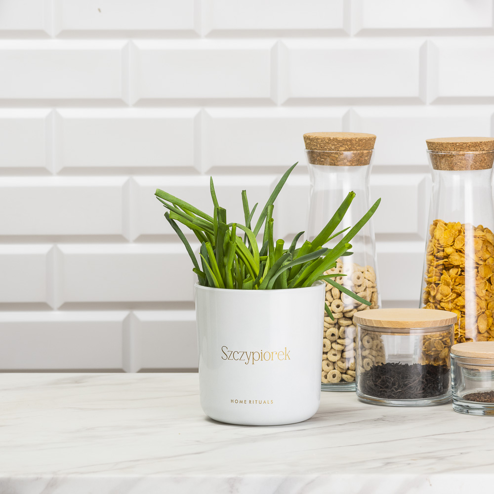 Doniczka osłonka biała ze złotym napisem Szczypiorek 13cm