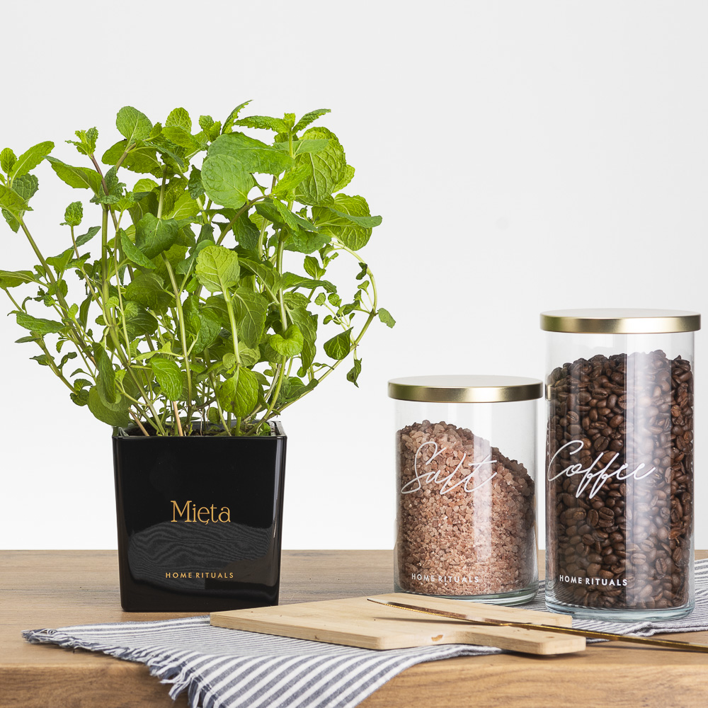 Stylowy napis wykonany metodą sitodruku w kolorze złotym nie tylko dodaje wyjątkowej klasy, ale również ułatwia organizację domowego zielnika, pomagając w estetycznej segregacji ziół.