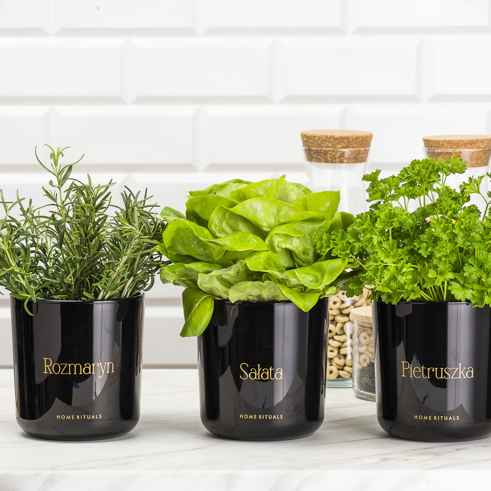 Stylowy napis wykonany metodą sitodruku w kolorze złotym nie tylko dodaje wyjątkowej klasy, ale również ułatwia organizację domowego zielnika, pomagając w estetycznej segregacji ziół.