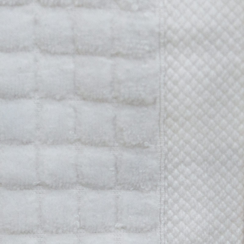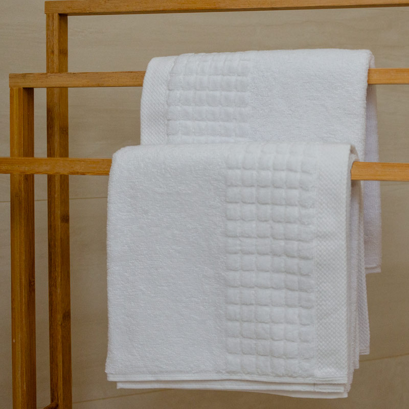 Ręcznik zdobiony jest elegancką bordiurą z motywem kostek – sześć kostek na jednym brzegu i trzy na drugim. Te subtelne, stylowe akcenty podkreślają jego nowoczesny design, który idealnie komponuje się zarówno z minimalistycznymi, jak i klasycznymi aranżacjami wnętrz.