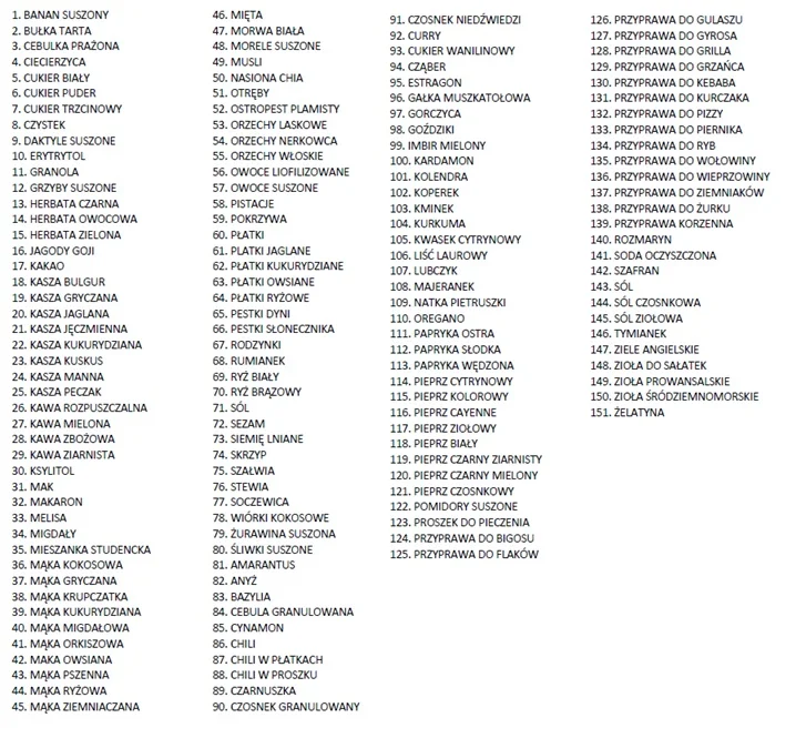 - Pełna lista produktów znajduje się pod linkiem Lista przypraw