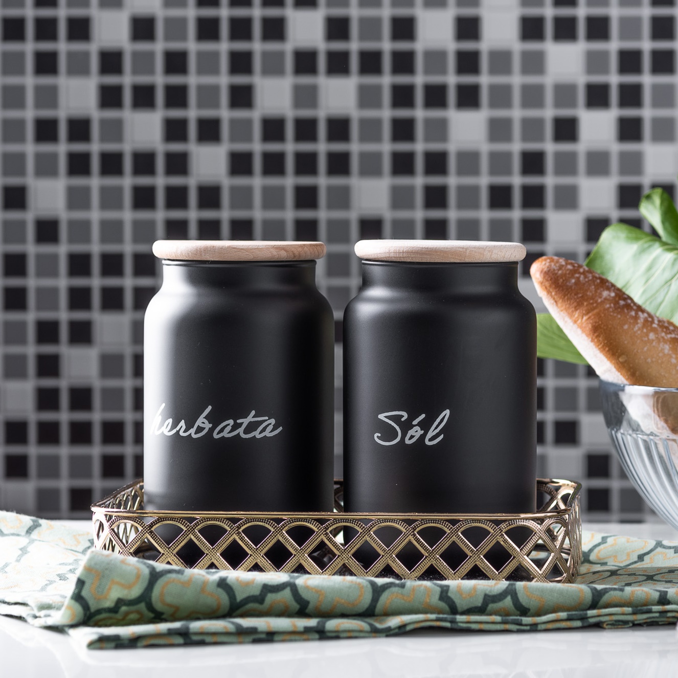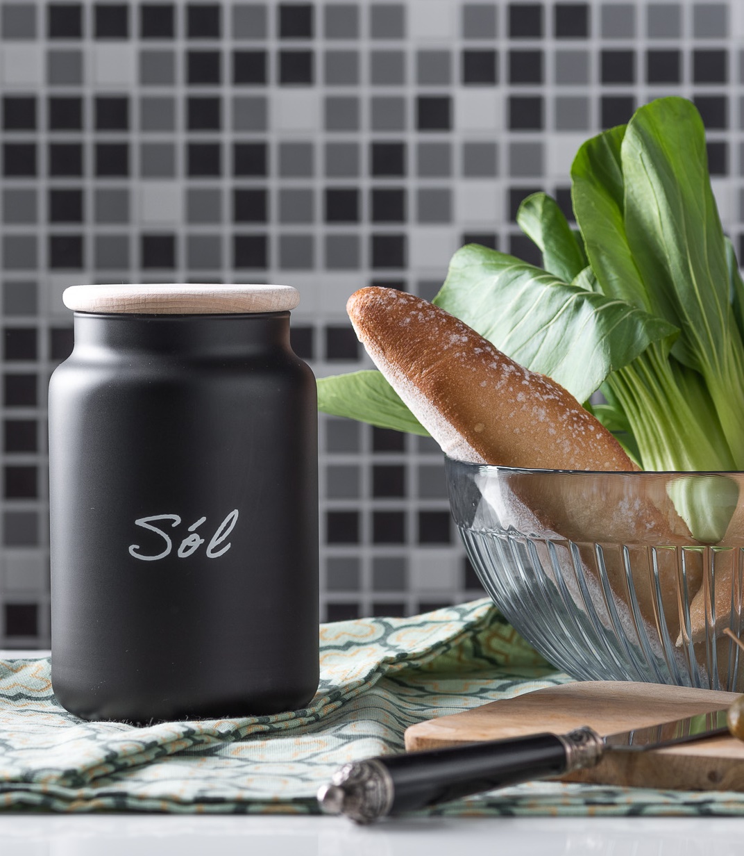 Pojemnik czarny z napisem sól idealnie sprawdzi się podczas codziennego przygotowywania potraw.