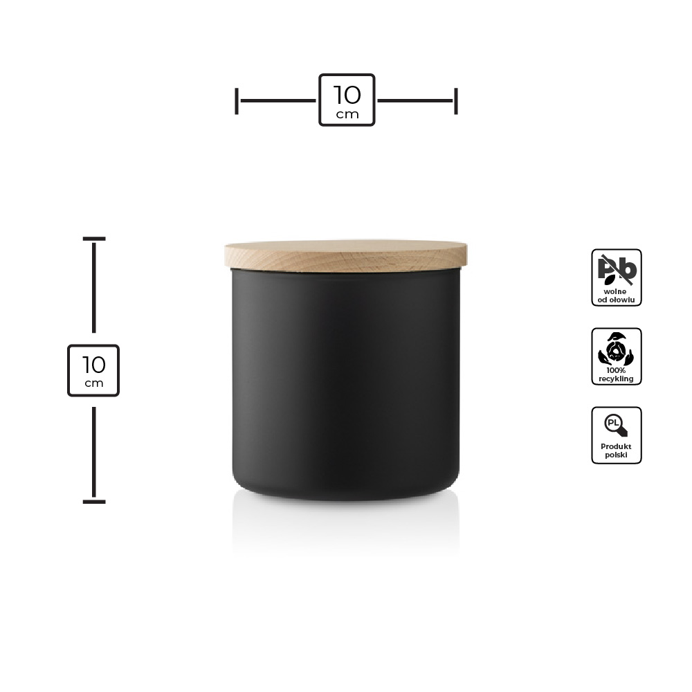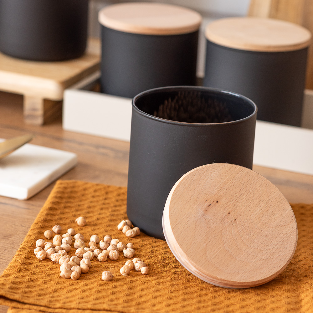 Praktyczny szklany pojemnik do przechowywania w kolorze czarnego matu z deklem drewnianym to doskonałe rozwiązanie do przechowywania różnorodnych produktów spożywczych. Jego uniwersalna, cylindryczna forma sprawia, że pasuje do każdej kuchni.