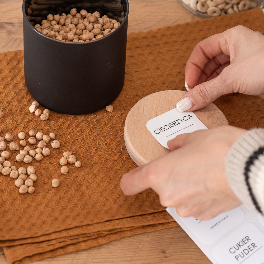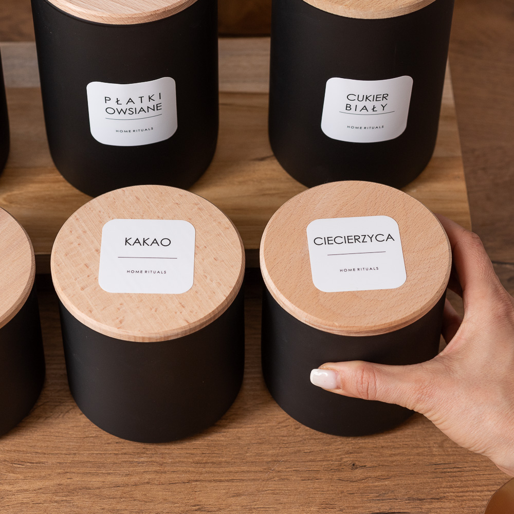 Aby ułatwić organizację, kolekcję PURE można uzupełnić o eleganckie naklejki, które pozwalają szybko odnaleźć odpowiednie składniki i i dobrze zorganizować domową spiżarnię.
