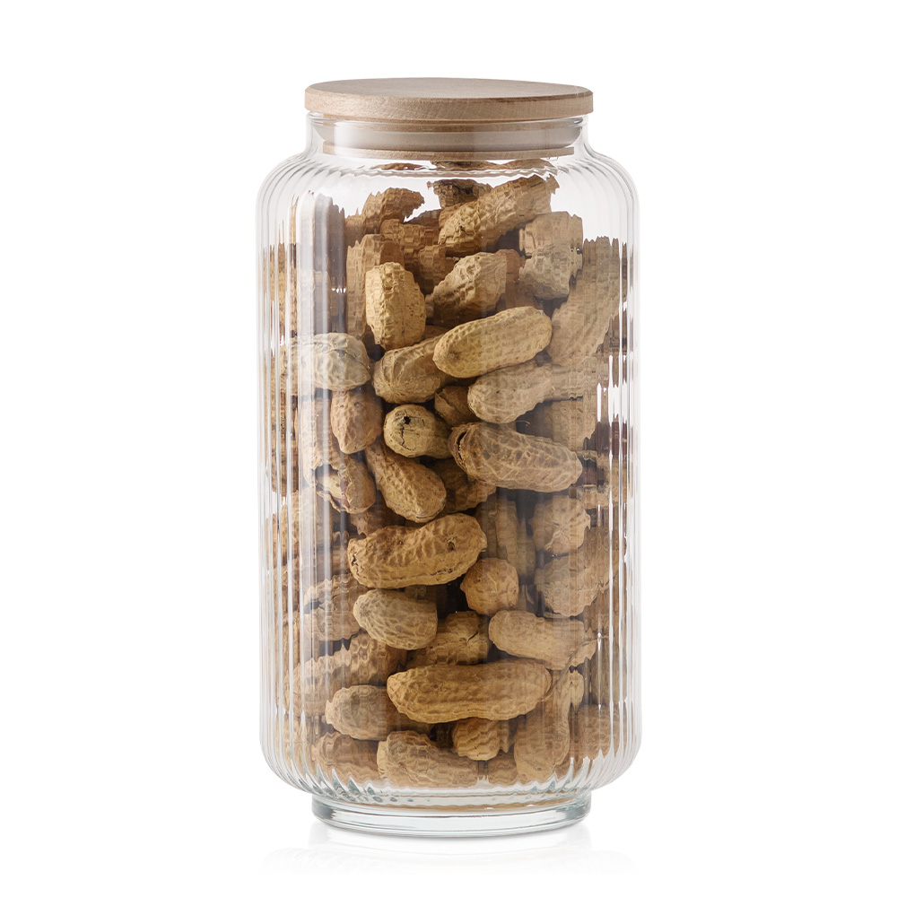 Praktyczny i elegancki szklany, ryflowany pojemnik do przechowywania z deklem drewnianym to doskonałe rozwiązanie do przechowywania różnorodnych produktów spożywczych.
