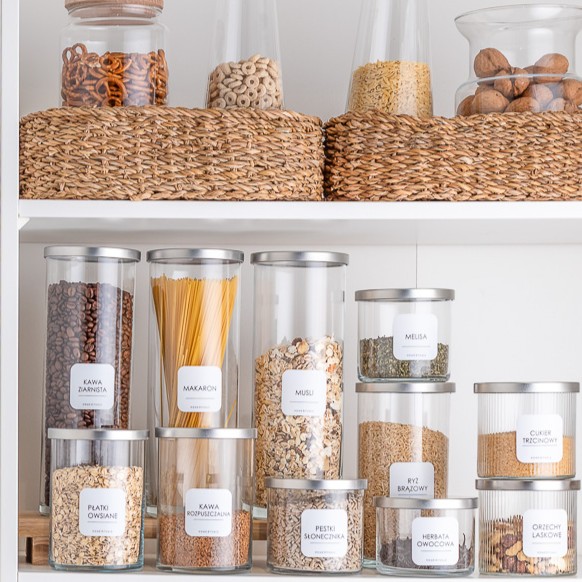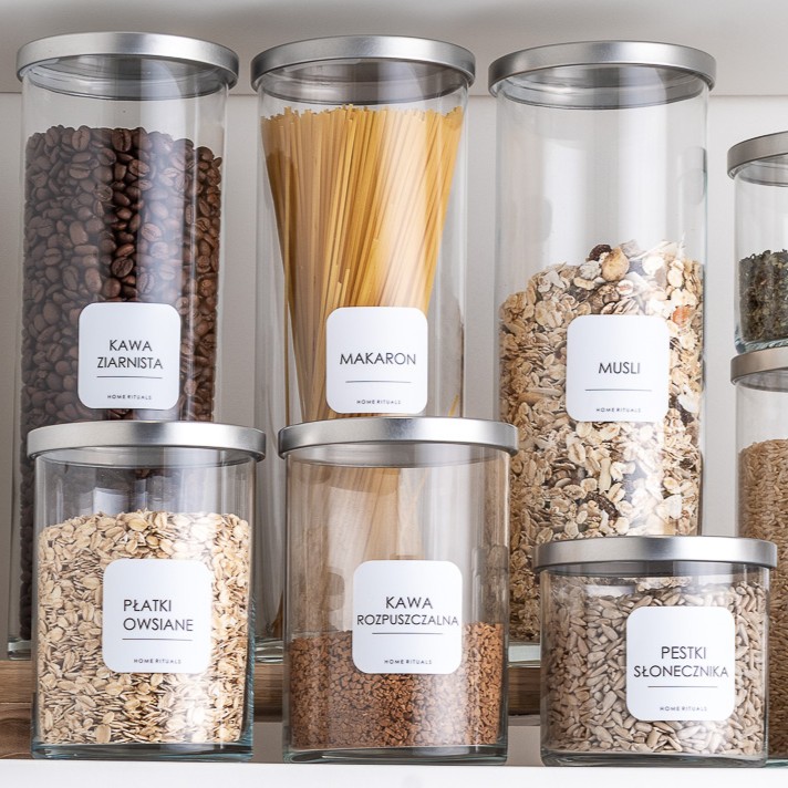 Aby ułatwić organizację, kolekcję PURE można uzupełnić o eleganckie naklejki, które pozwalają szybko odnaleźć odpowiednie składniki i i dobrze zorganizować domową spiżarnię.