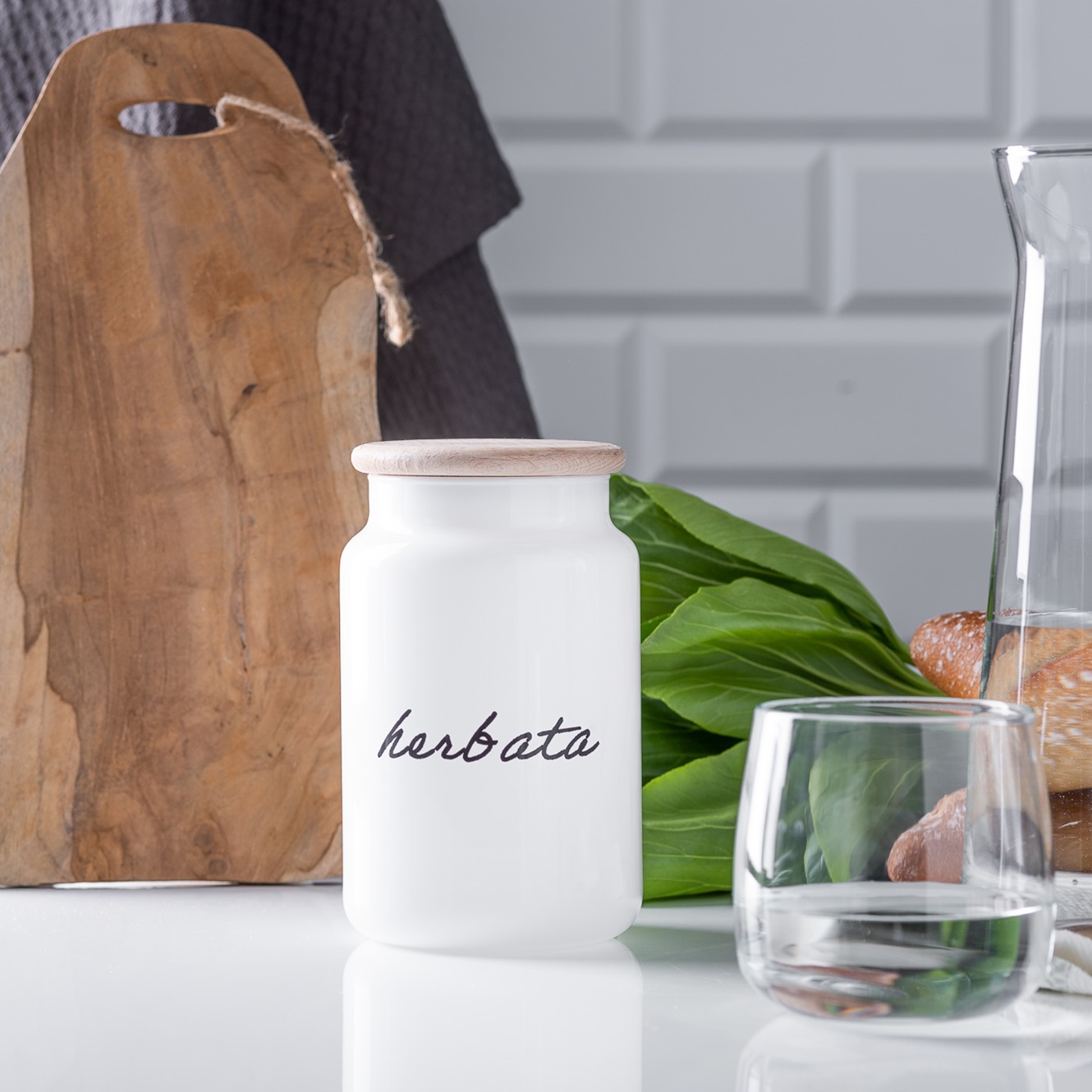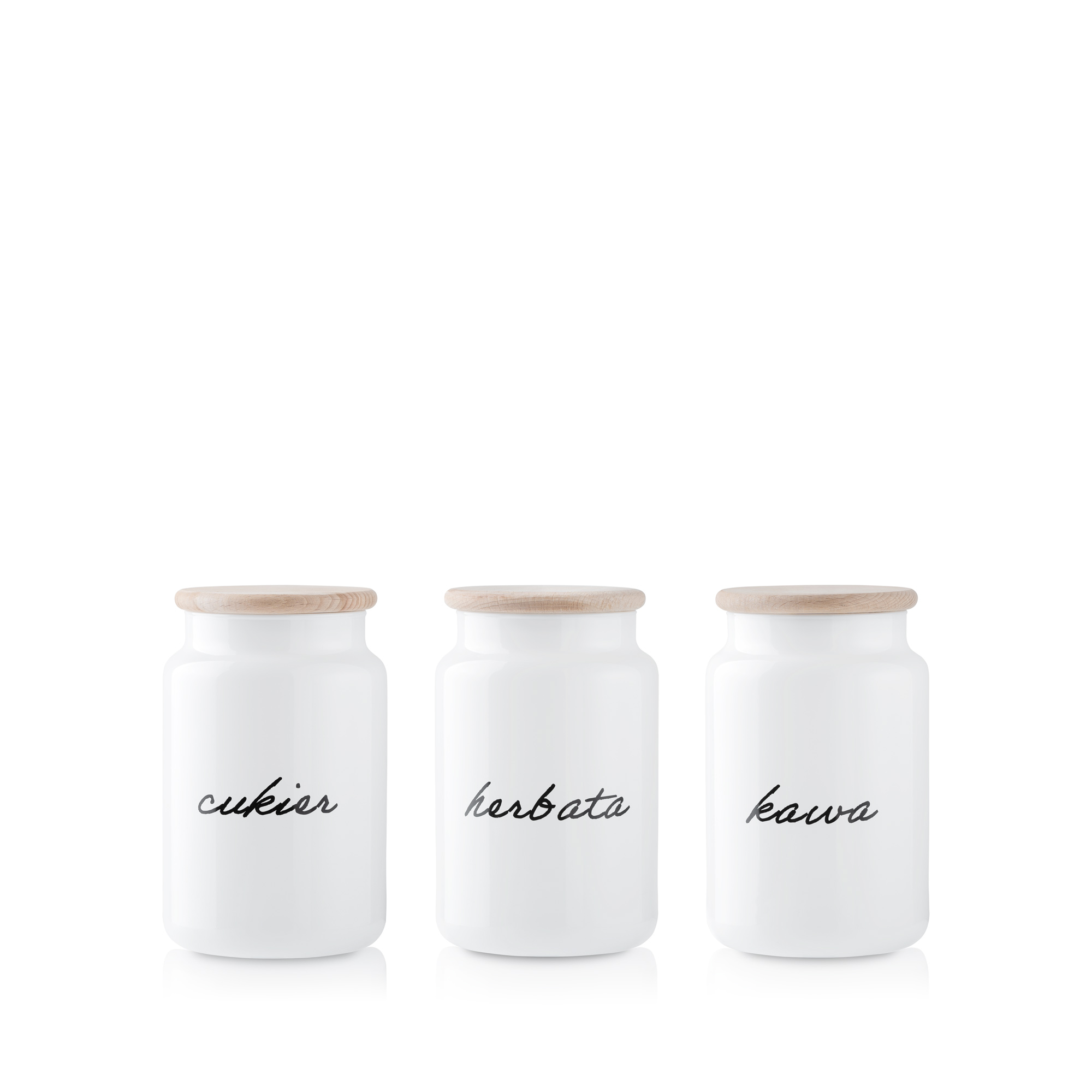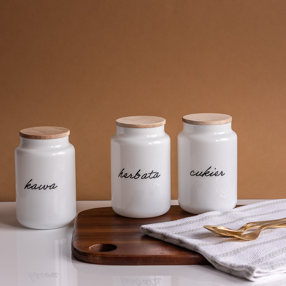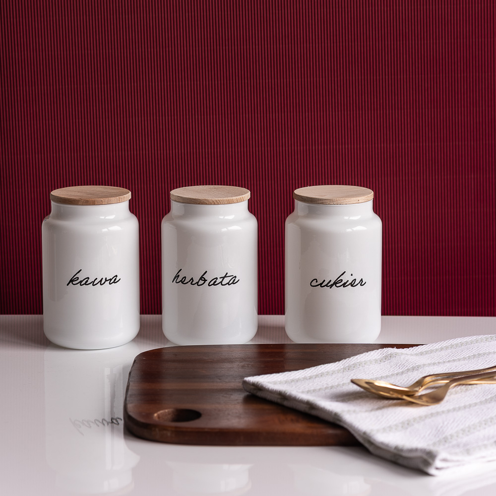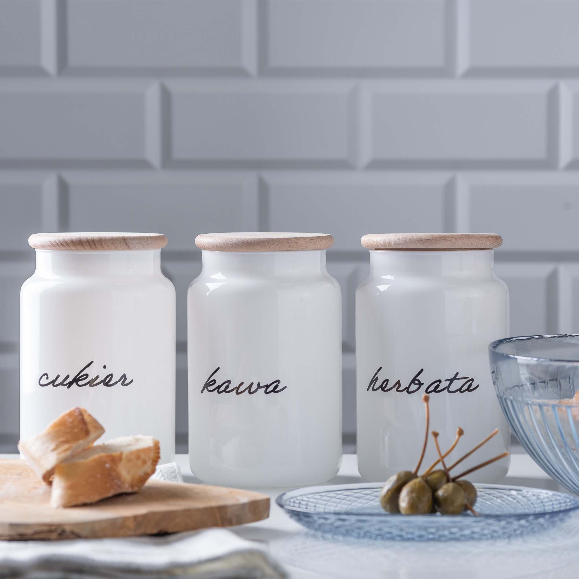 Na każdym pojemniku znajduje się czarny napis wykonany kursywą, co dodaje im jeszcze większej stylu i elegancji. Do kompletu dołączone są trzy drewniane dekle z uszczelką, które skutecznie chronią przechowywane produkty przed wilgocią. Dzięki temu można zachować ich świeżość i aromat na dłużej.