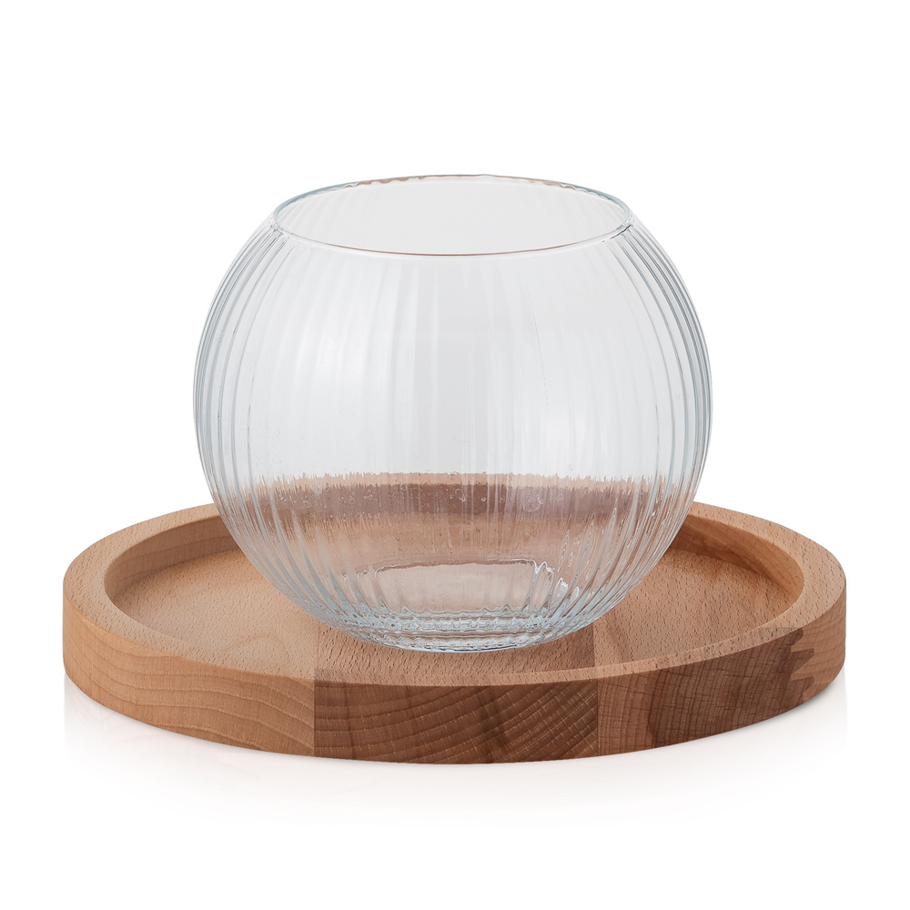 Świecznik szklany kula D8 ryflowana z drewnianą podstawką