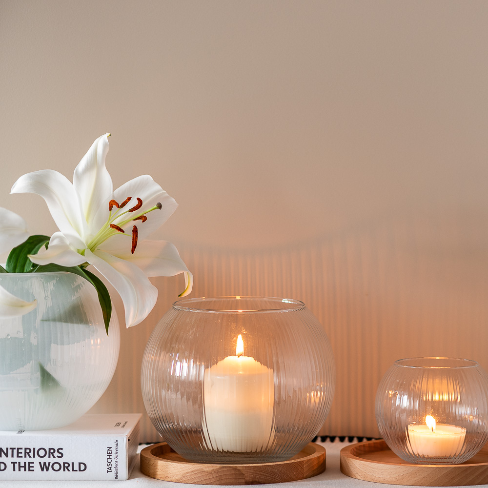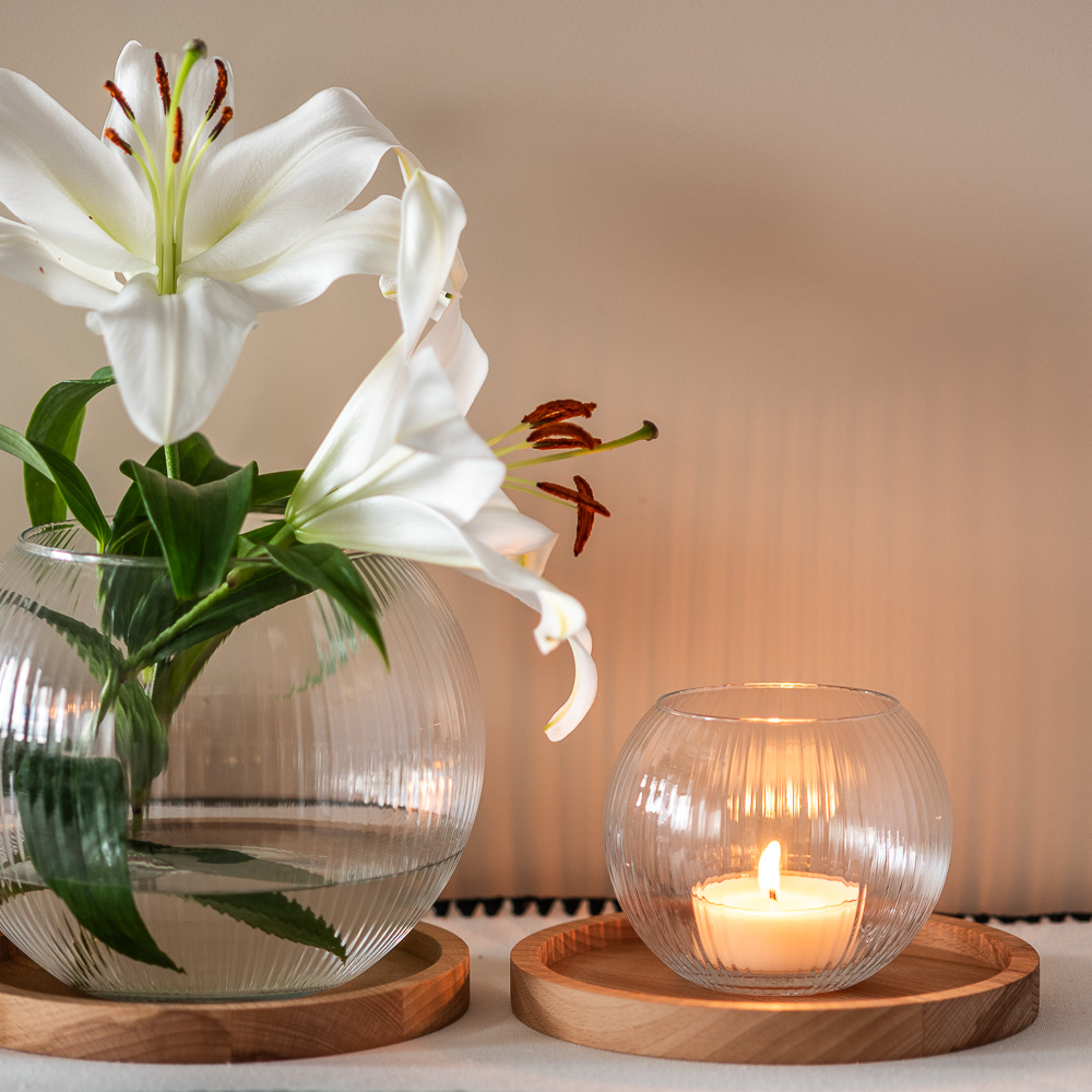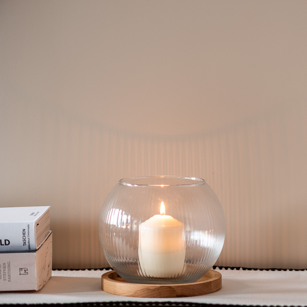 Świecznik w kształcie niskiej kuli o delikatnym, ryflowanym wykończeniu w połączeniu z drewnianą podstawką tworzy harmonijną i stylową całość.