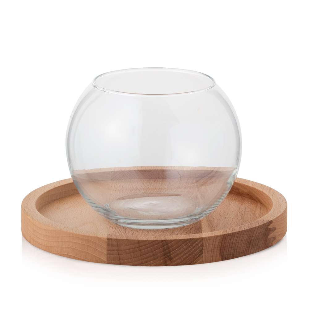 Świecznik szklany kula z drewnianą podstawką, nr produktu: 35105 Z PODSTAWK D18 H1,8