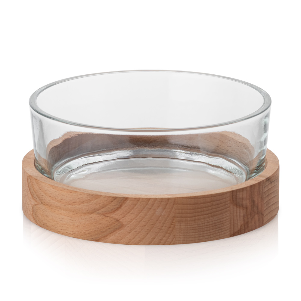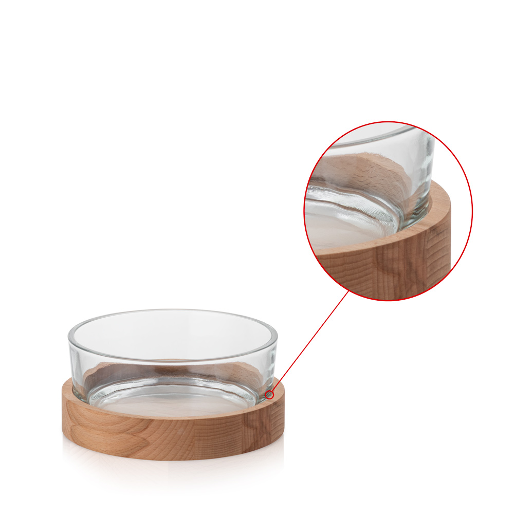 Świecznik szklany misa szer. 19 cm z drewnianą podstawką