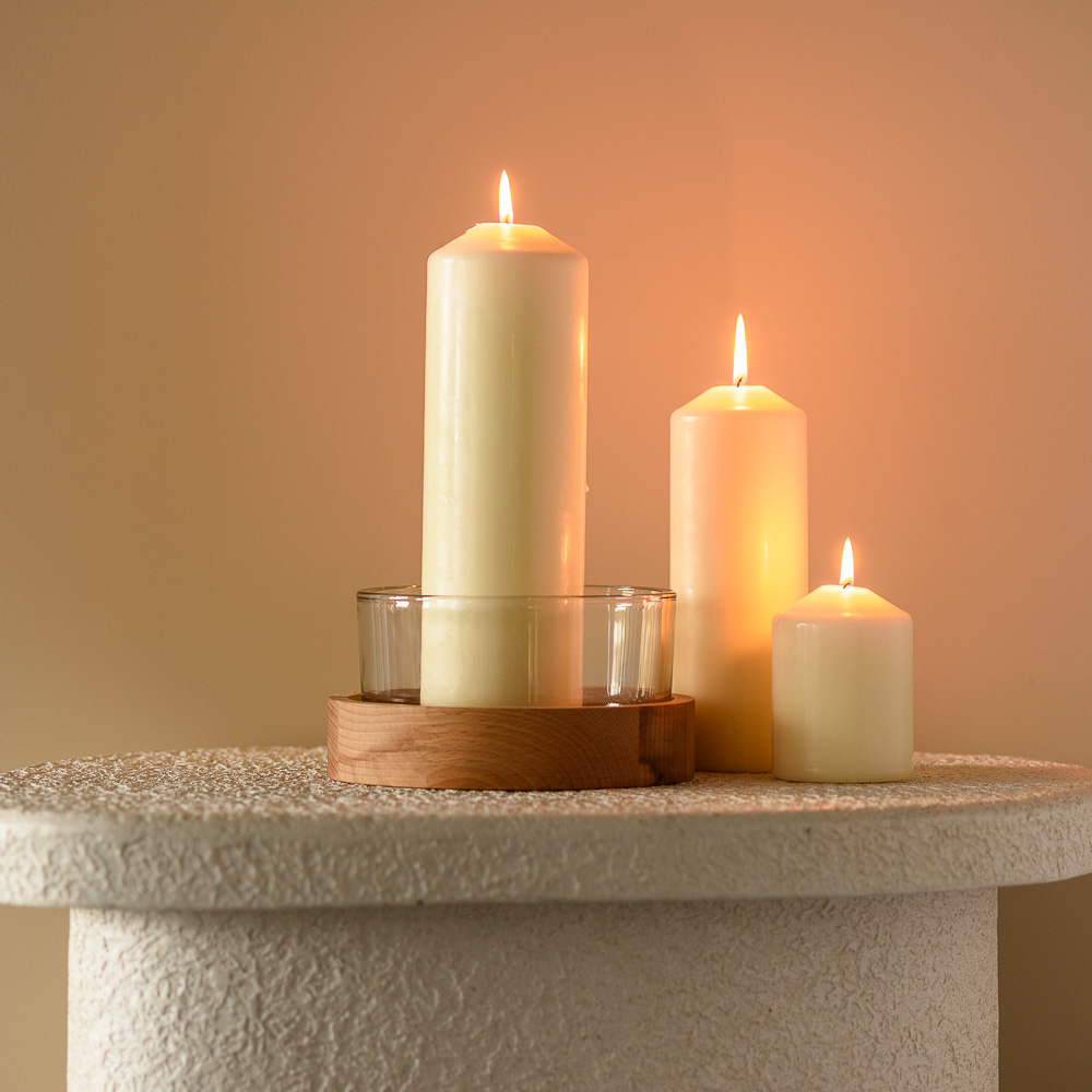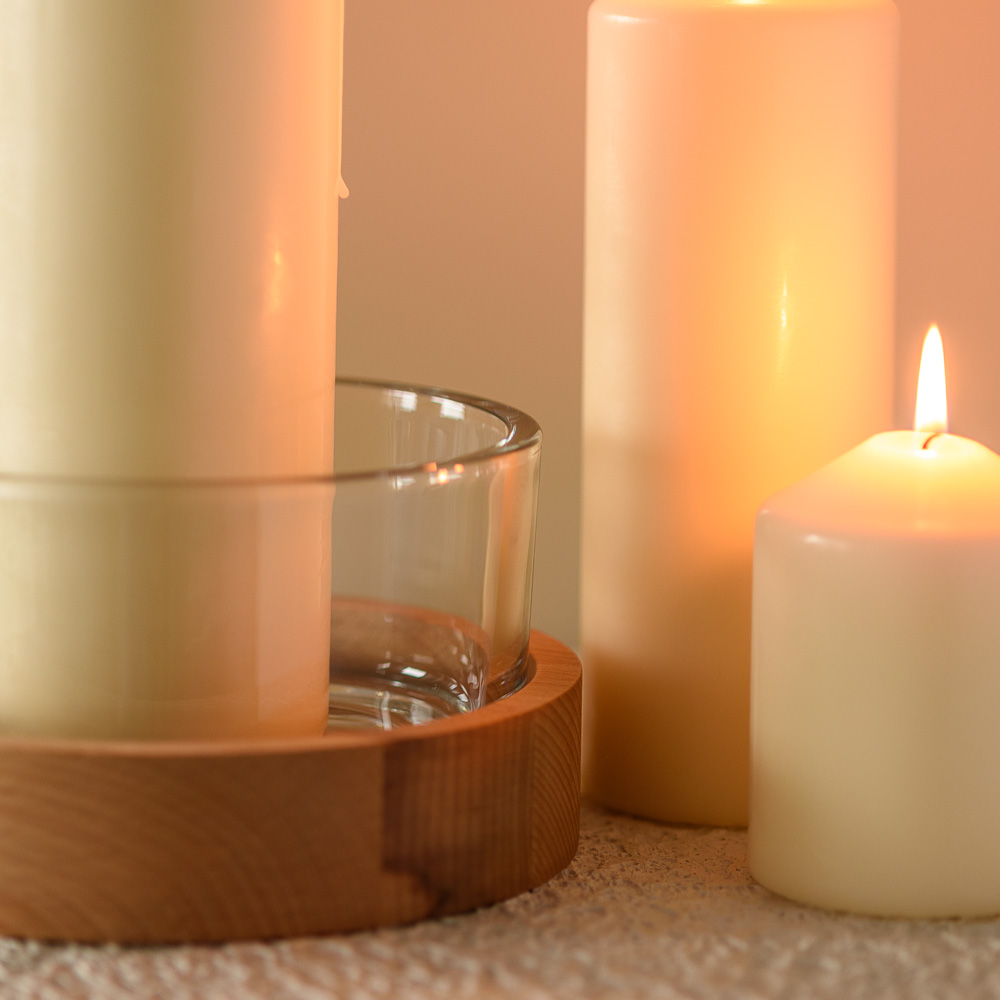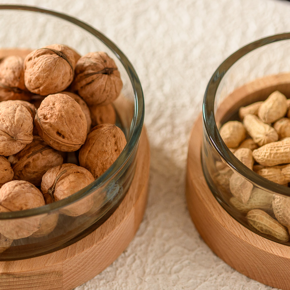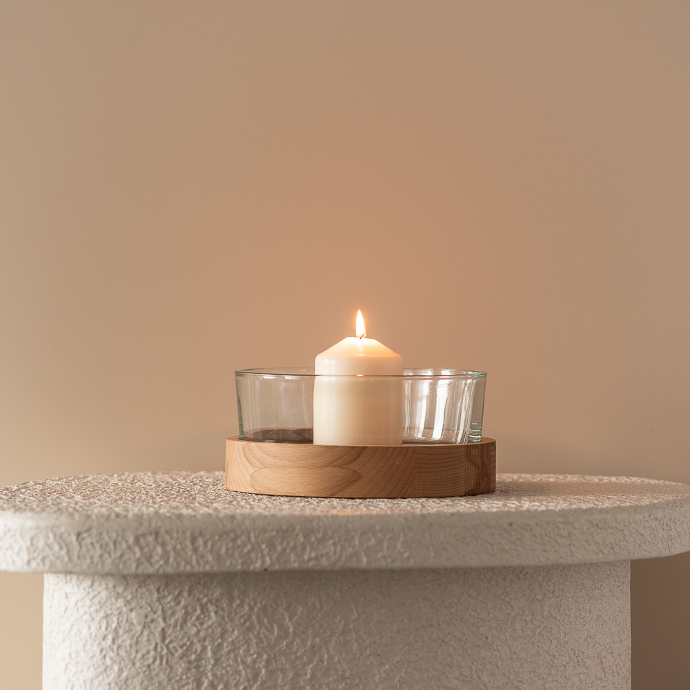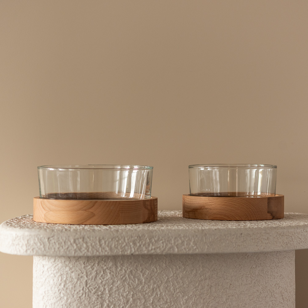 Szklany świecznik o średnicy 19 cm i pojemności 1430 ml w połączeniu z drewnianą podstawką z bukowego drewna tworzy wyjątkowy duet, który zachwyca prostotą i funkcjonalnością.