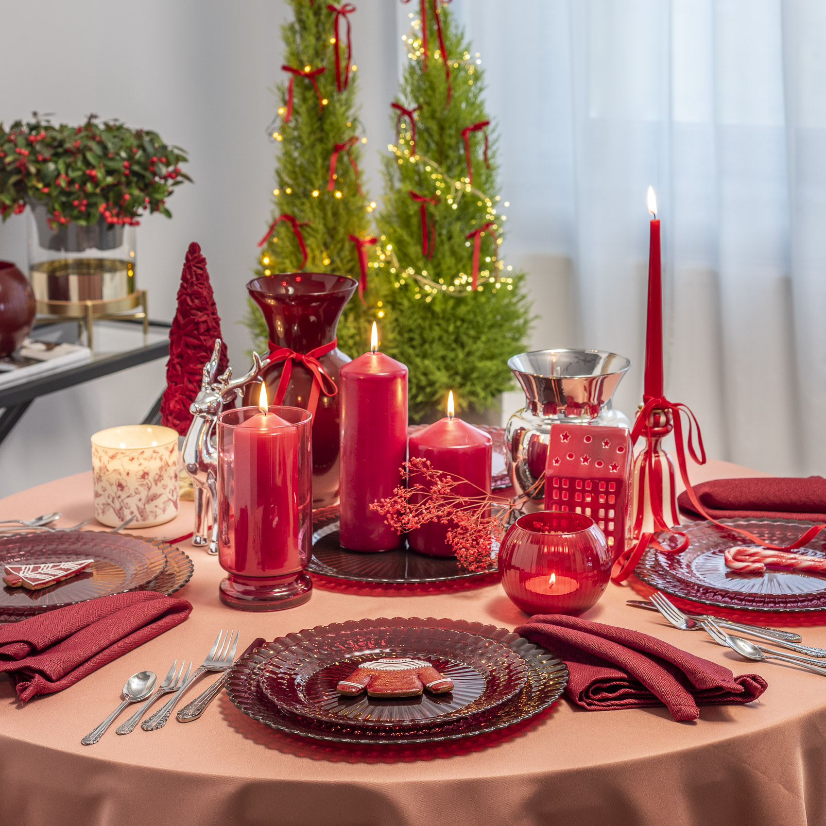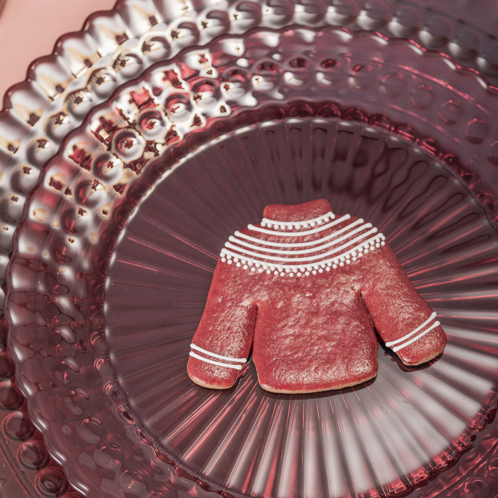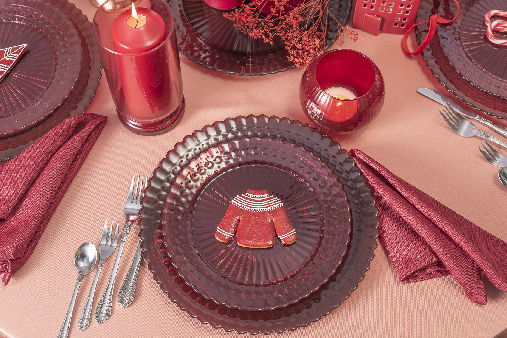 Zestaw eleganckich obiadowych talerzy w transparentnym bordowym kolorze, o subtelnym, nowoczesnym designie, który dobrze komponuje się z różnymi stylami nakrycia stołu. Designerski wzór doda klasy każdej aranżacji.