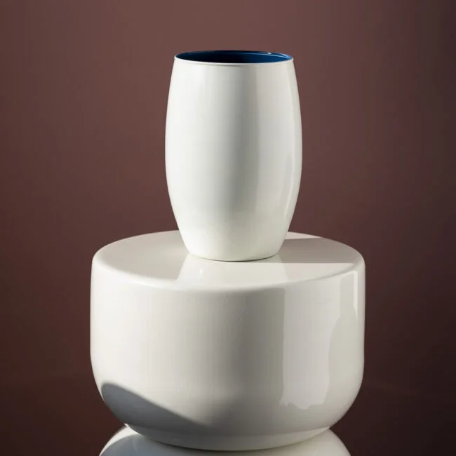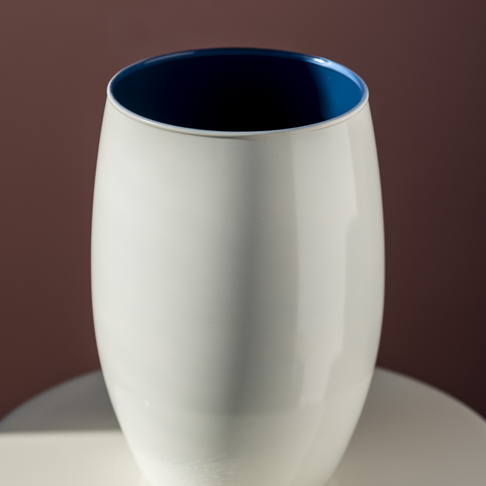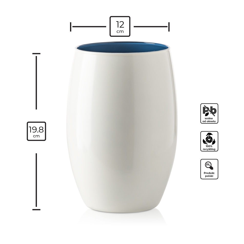 Z perspektywy dekoratora wnętrz ten kremowy wazon z delikatnym granatowym wnętrzem to wyjątkowy element, który wnosi do przestrzeni subtelną elegancję i świeżość. Jego minimalistyczna forma i pastelowa kolorystyka sprawiają, że doskonale komponuje się z różnymi stylami wnętrzarskimi – od klasycznego, przez skandynawski, boho, aż po nowoczesny i minimalistyczny.