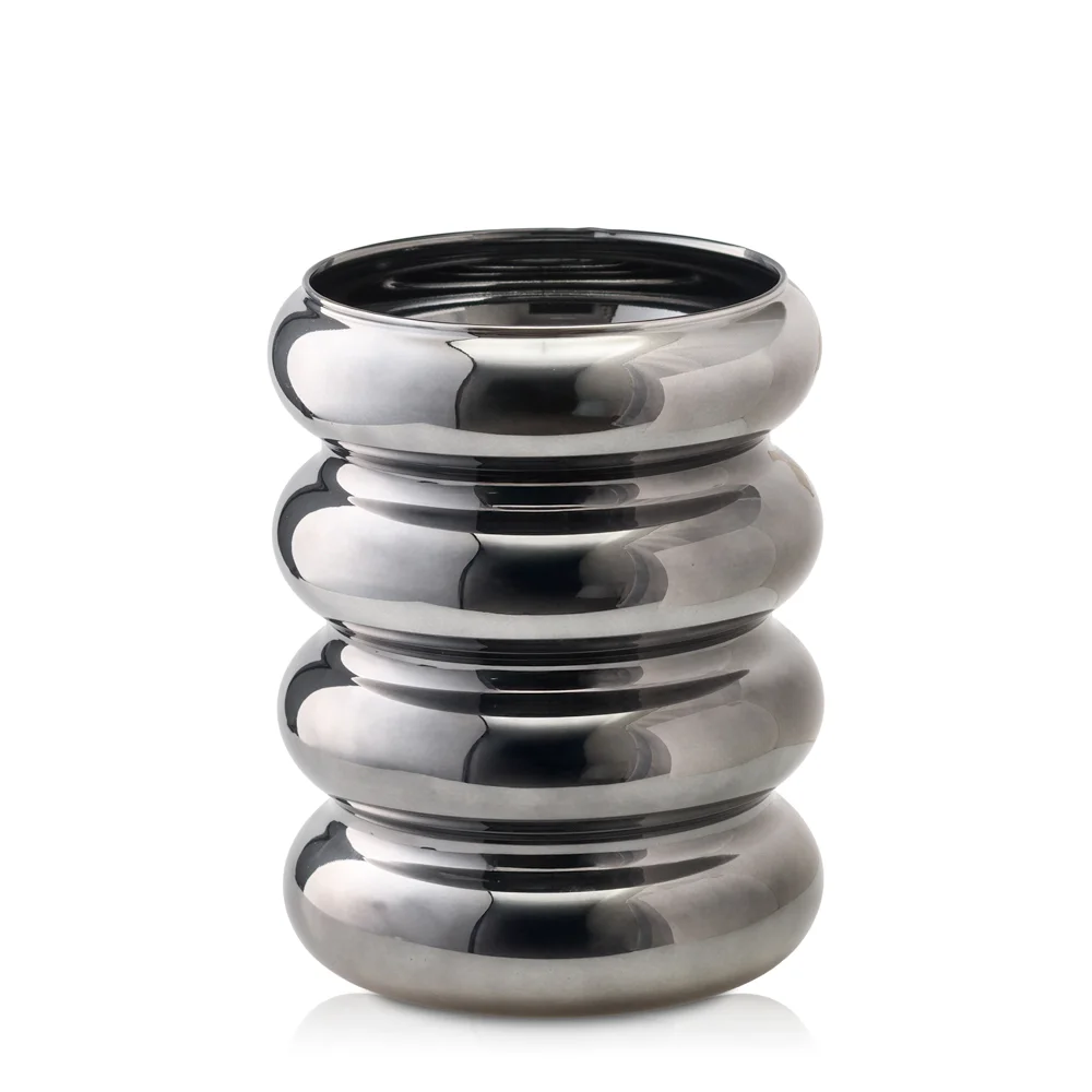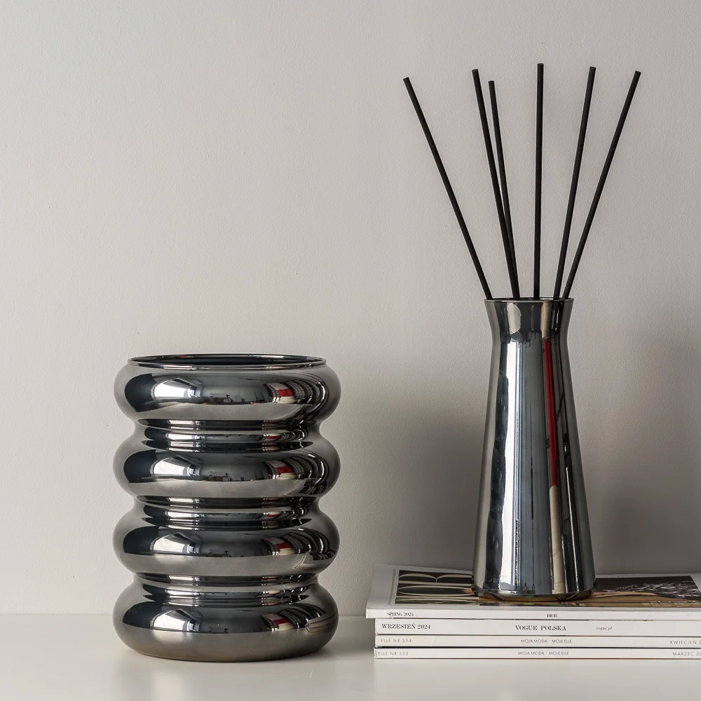 Dekoracyjny wazon o harmonijnej, rzeźbiarskiej formie, wykonany z wysokiej jakości szkła i wykończony metalizacją w kolorze obsydianu.